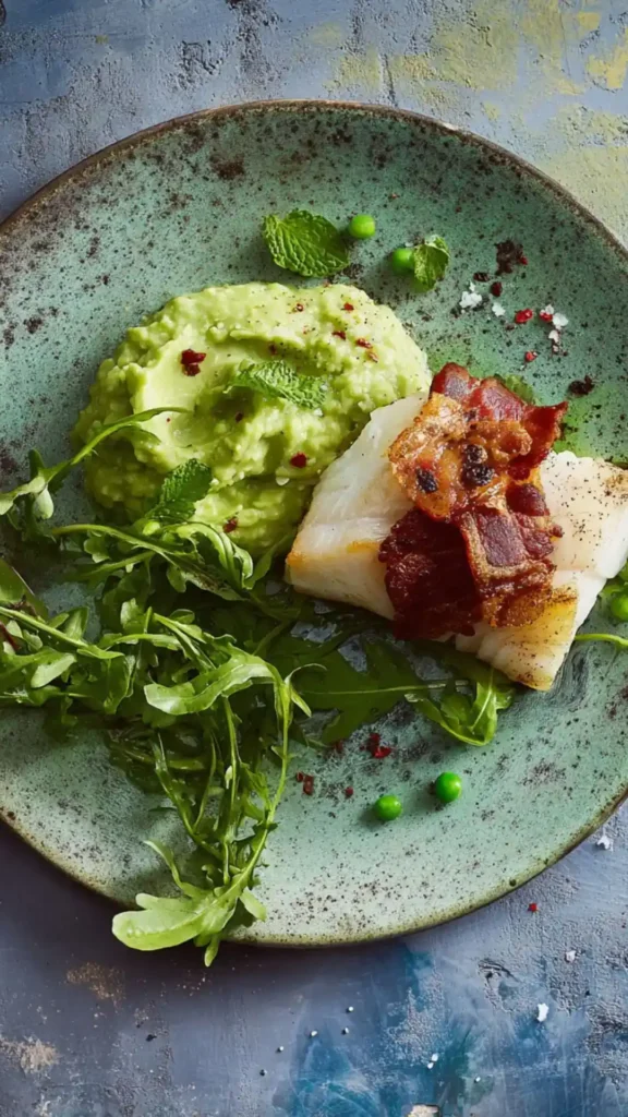 A simple yet elegant cod recipe with crispy pancetta and creamy pea mash, perfect for a quick dinner or dinner party.
