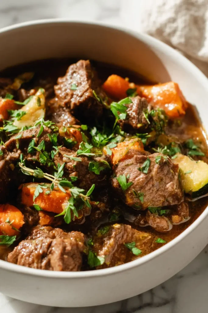 A rich, hearty, and flour-free beef stew that uses zucchini and blended vegetables to create a thick gravy without the carbs.