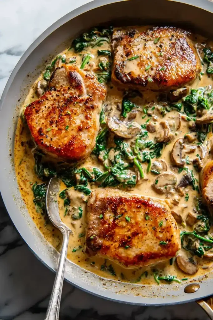 Tender pan-seared pork chops smothered in a rich, keto-friendly creamy garlic mushroom and spinach sauce.