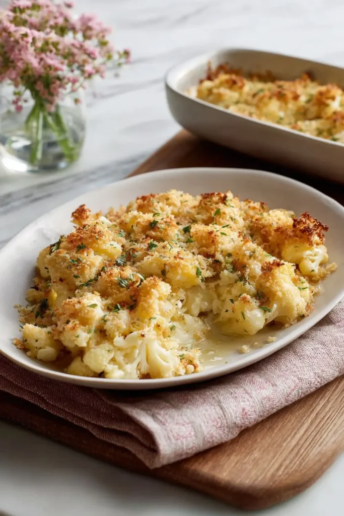 - Assemble and bake: Transfer the roasted cauliflower to the prepared baking dish. Pour the rich cheese sauce evenly over the cauliflower. Sprinkle the herbed panko mixture on top. Bake until the panko is deep golden brown and the cauliflower is tender, about 25 minutes. Let rest for 15 minutes before serving to allow the sauce to set.