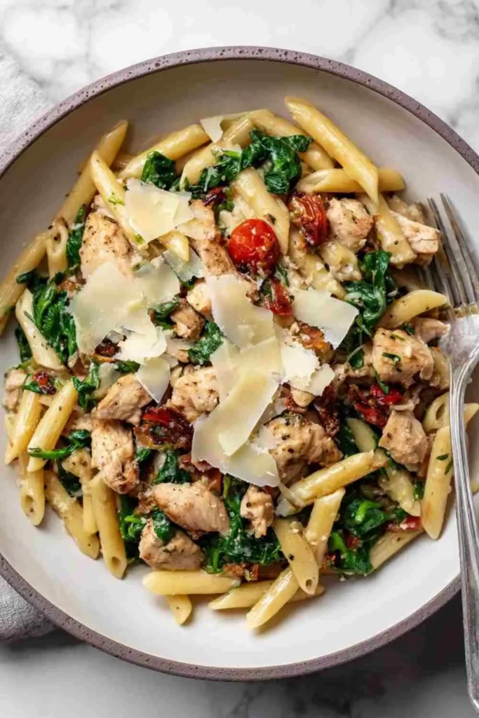 - Combine everything: Turn off the heat. Add spinach, tomatoes, cooked chicken, and pasta to the skillet. Toss well so spinach wilts and ingredients combine evenly.